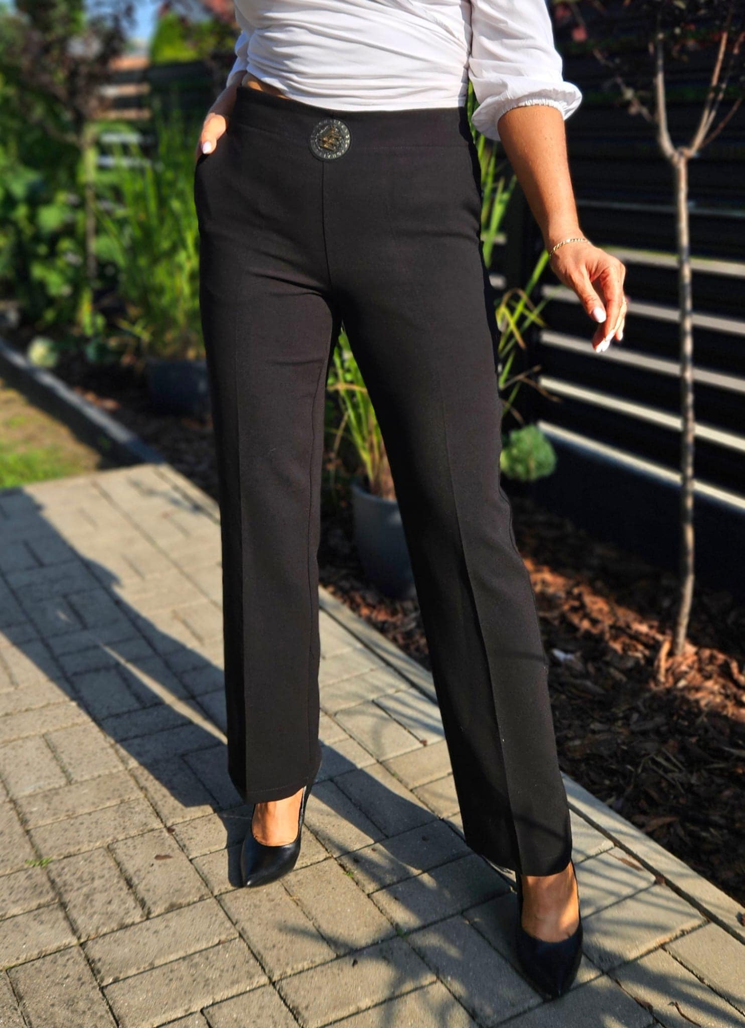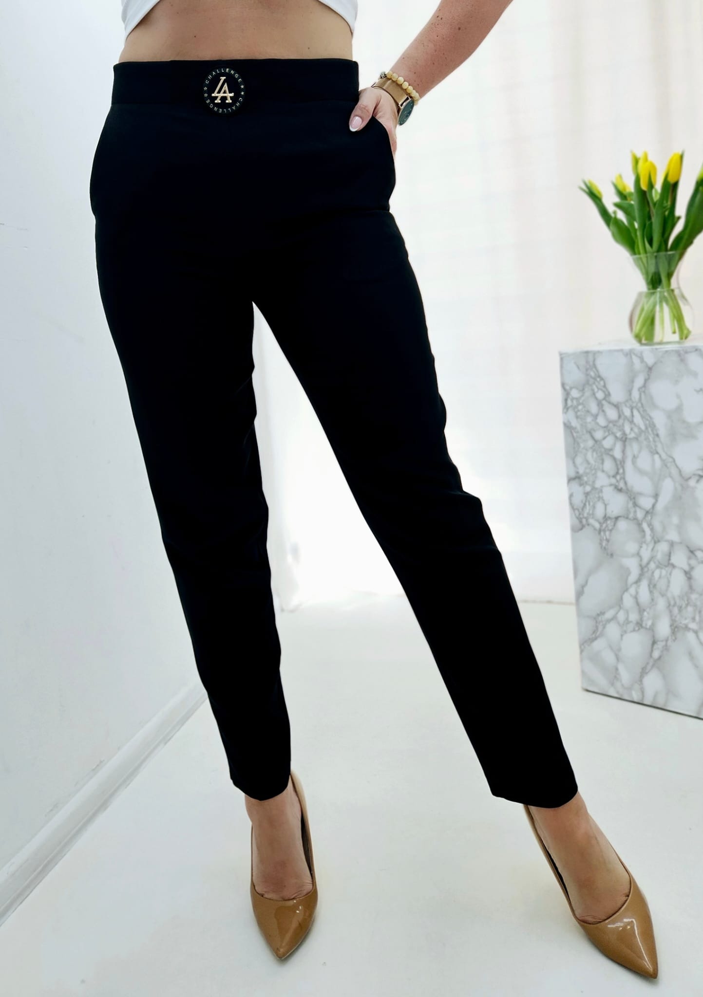 Juodos kelnės su kišenėmis ir guma per liemenį. Be užtrauktuko ir sagų.