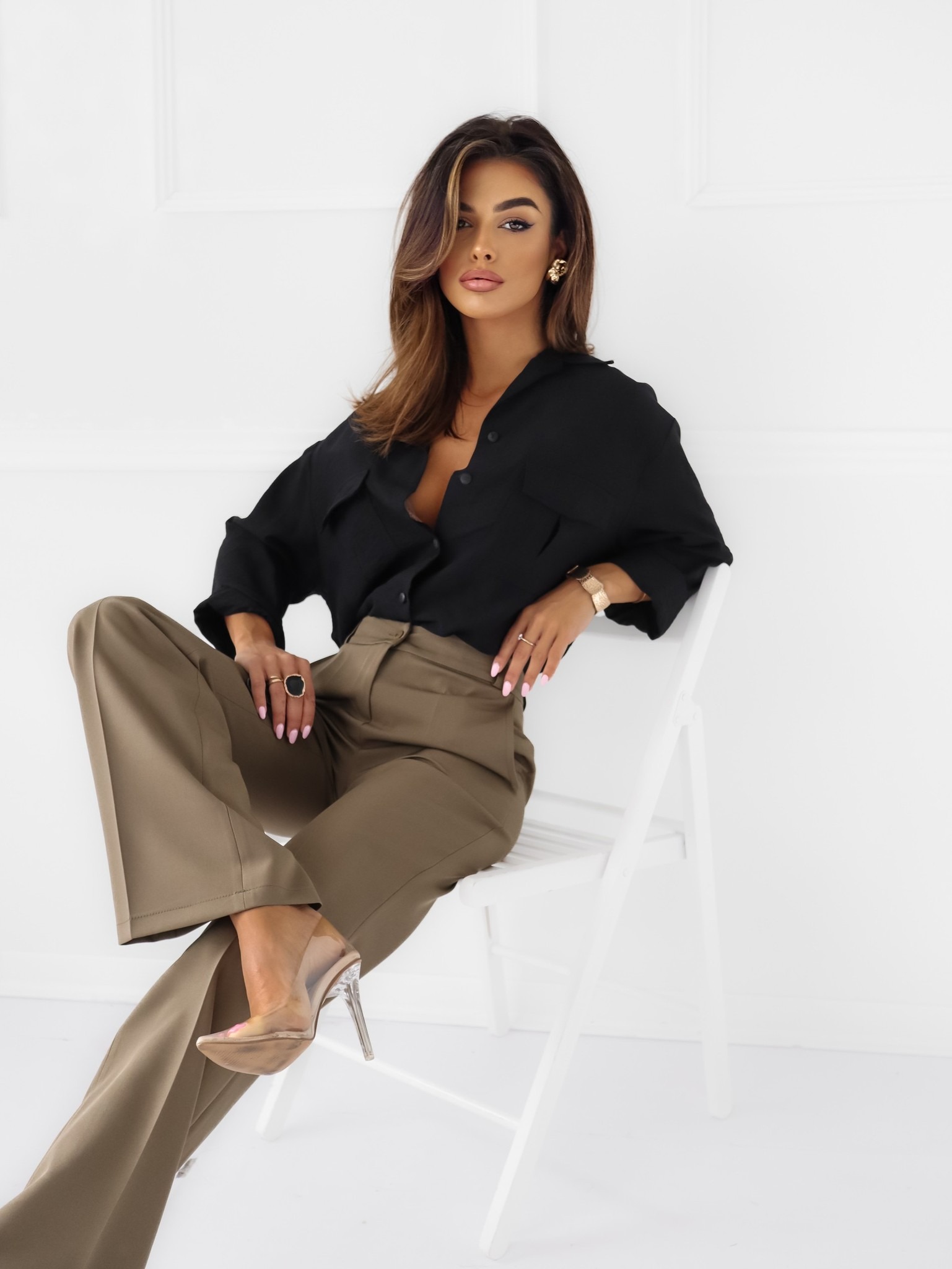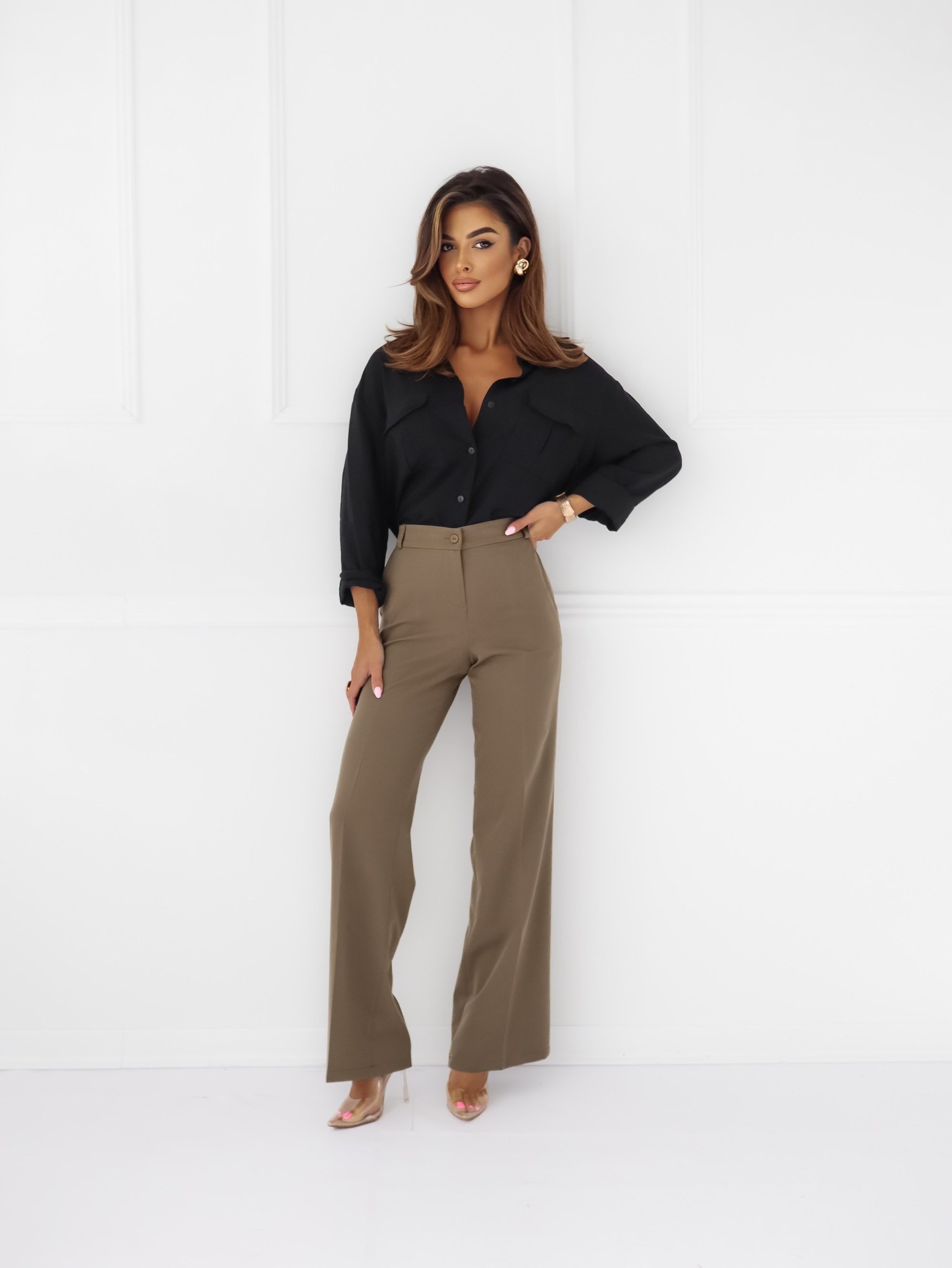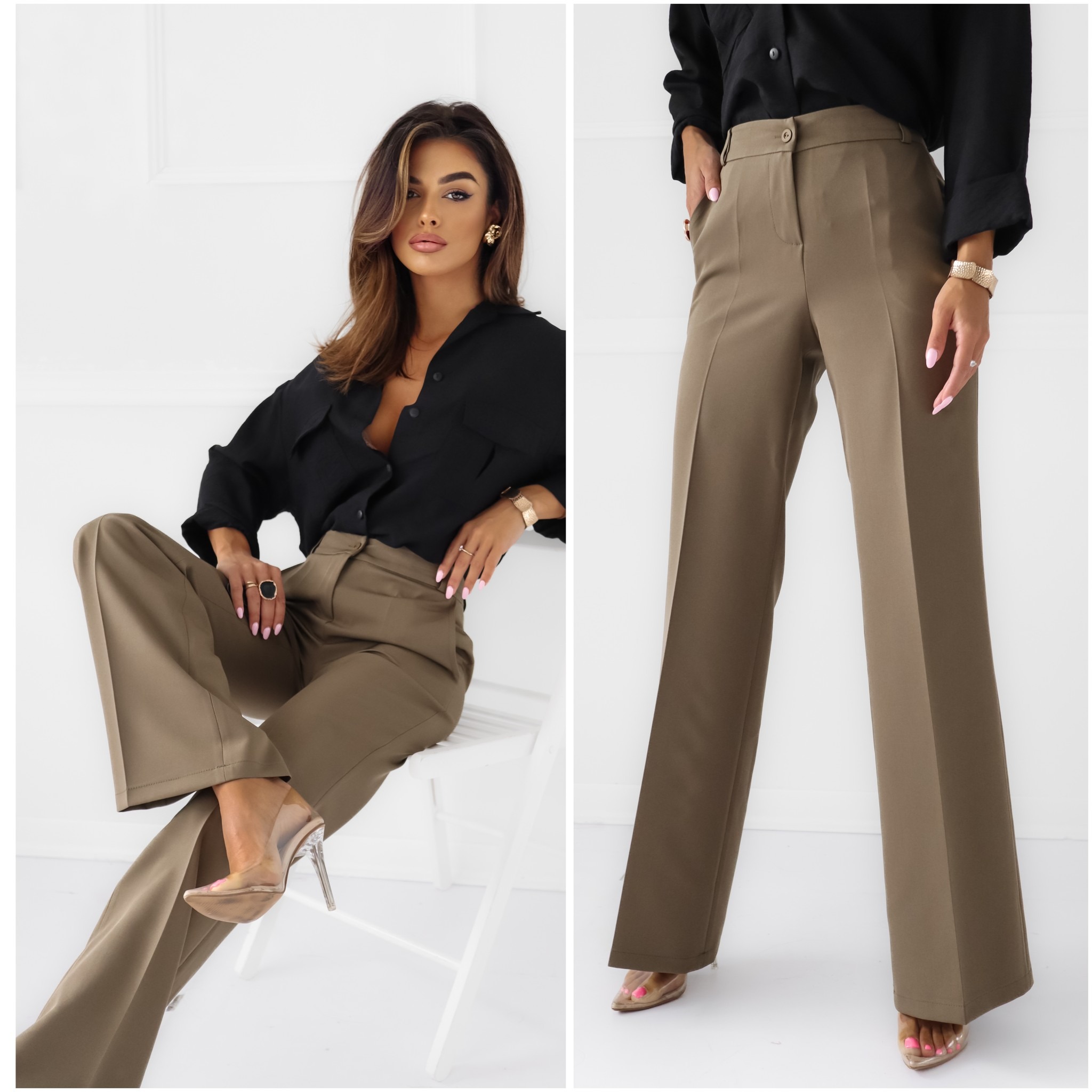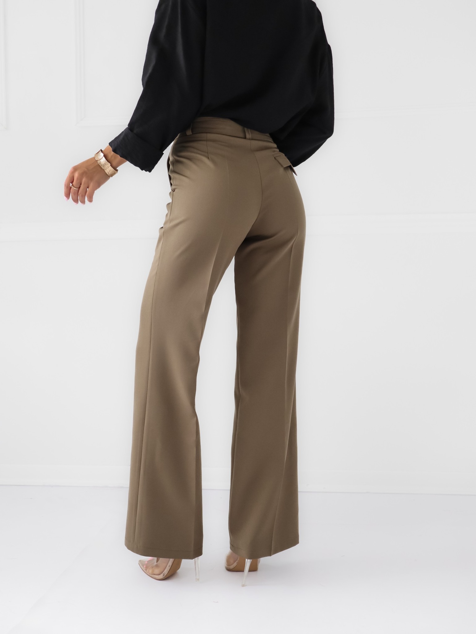 Rudos, plačios kelnės moterims žemesniu liemeniu, užsegamos užtrauktuku ir saga. Yra kišenės.