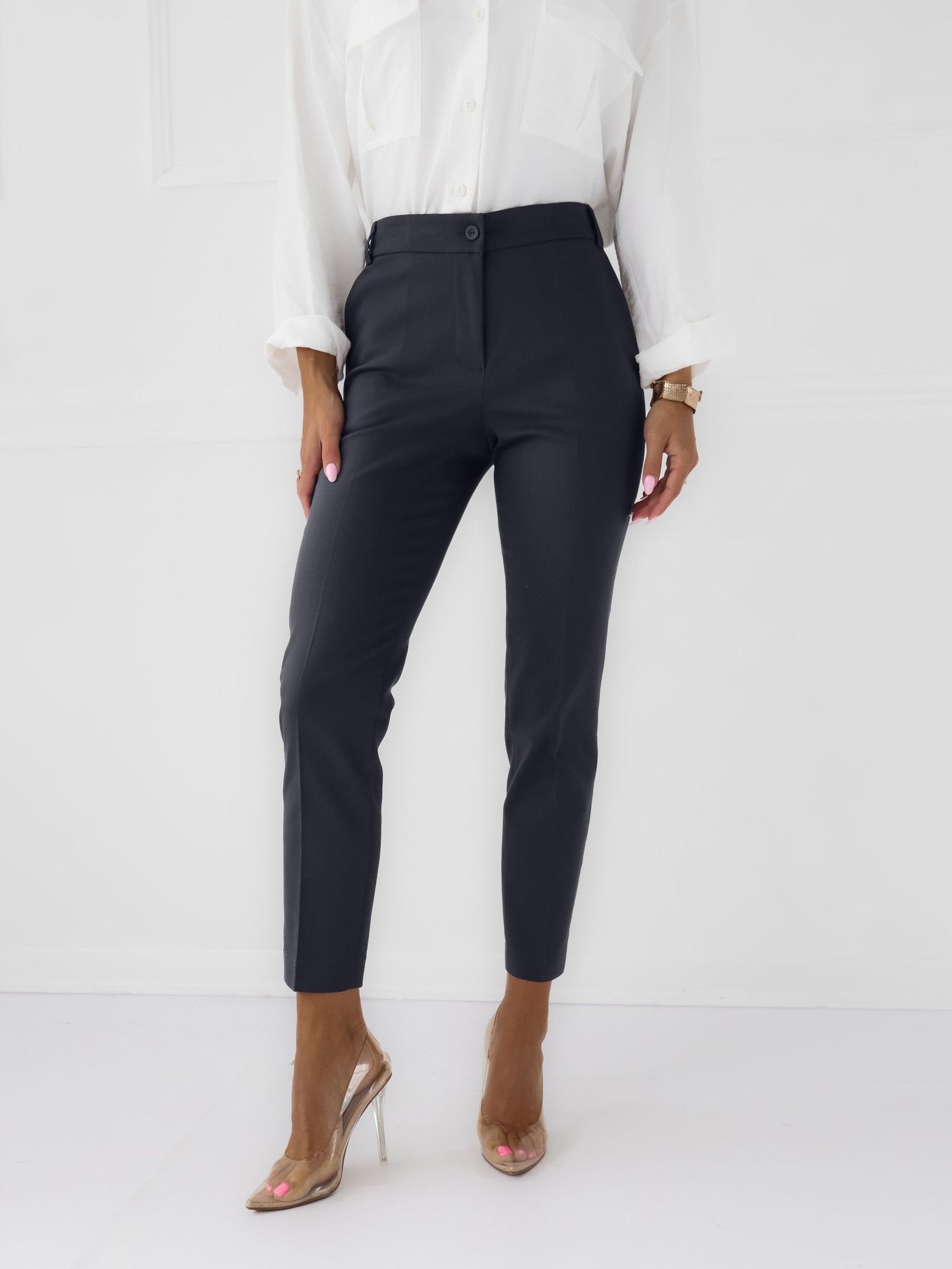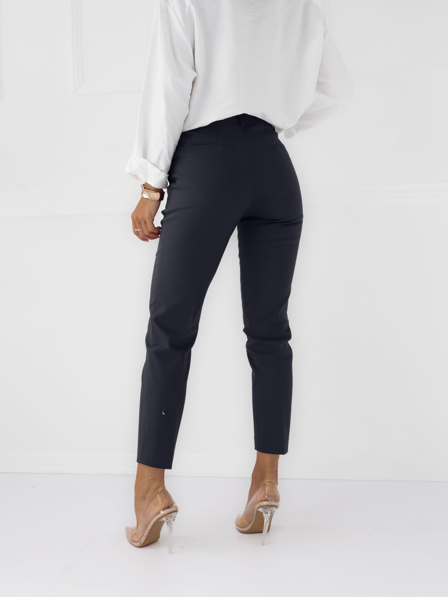 Klasikinės juodos trumpesnės kelnės su kišenėmis. Užsegamos užtrauktuku ir saga.