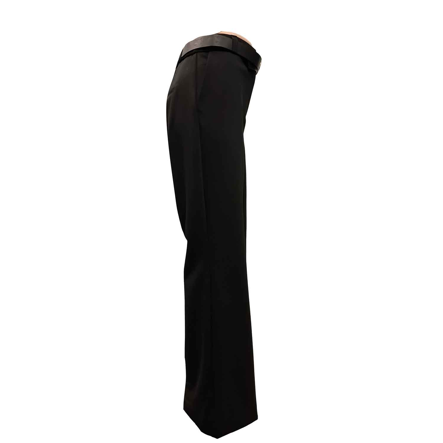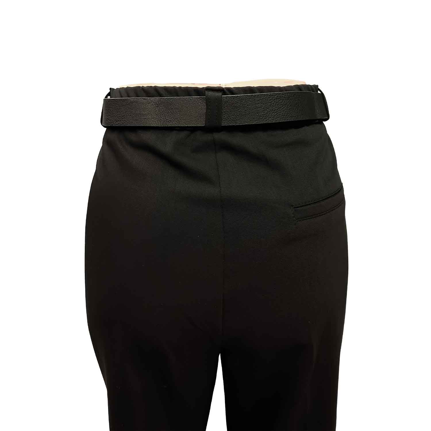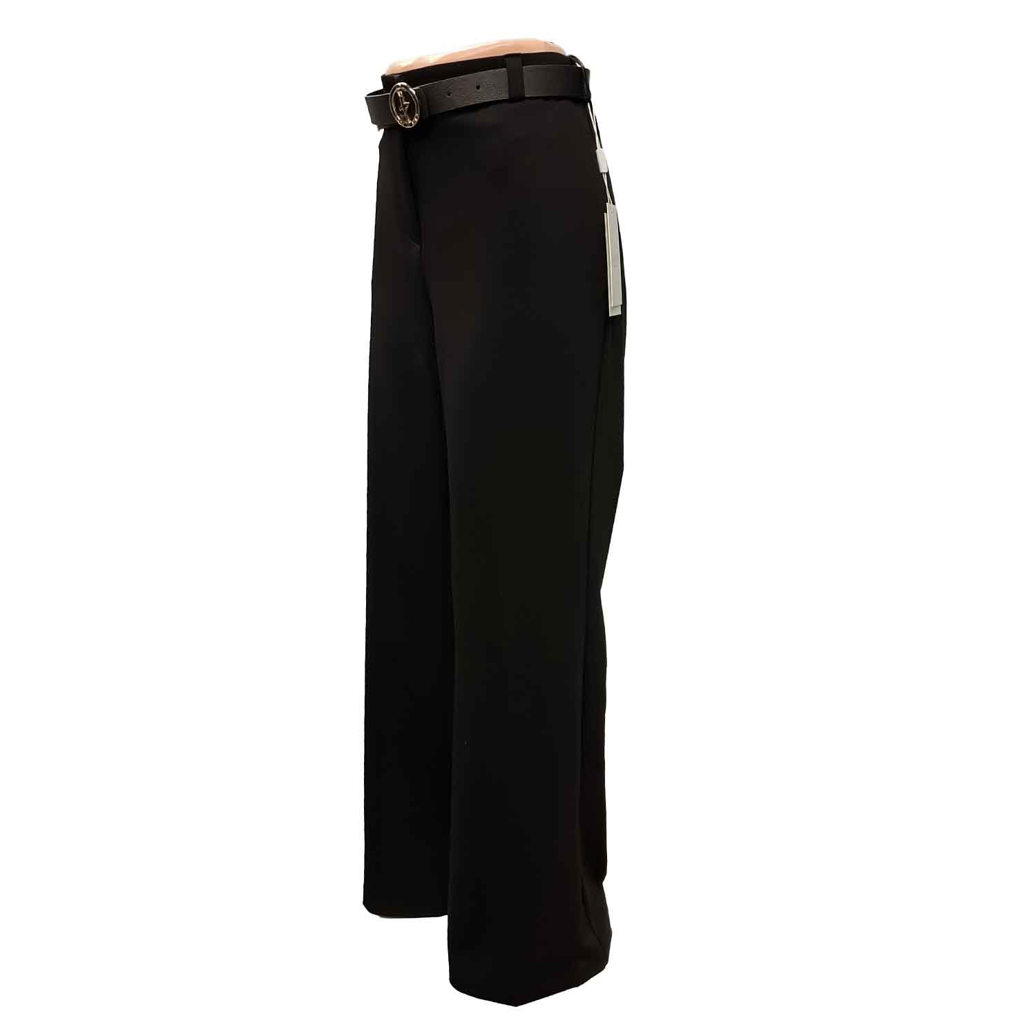 Stilingos, ilgos ir plačios juodos kelnės moterims su guma per liemenį, užsegamos užtrauktuku ir saga. Yra kišenės.