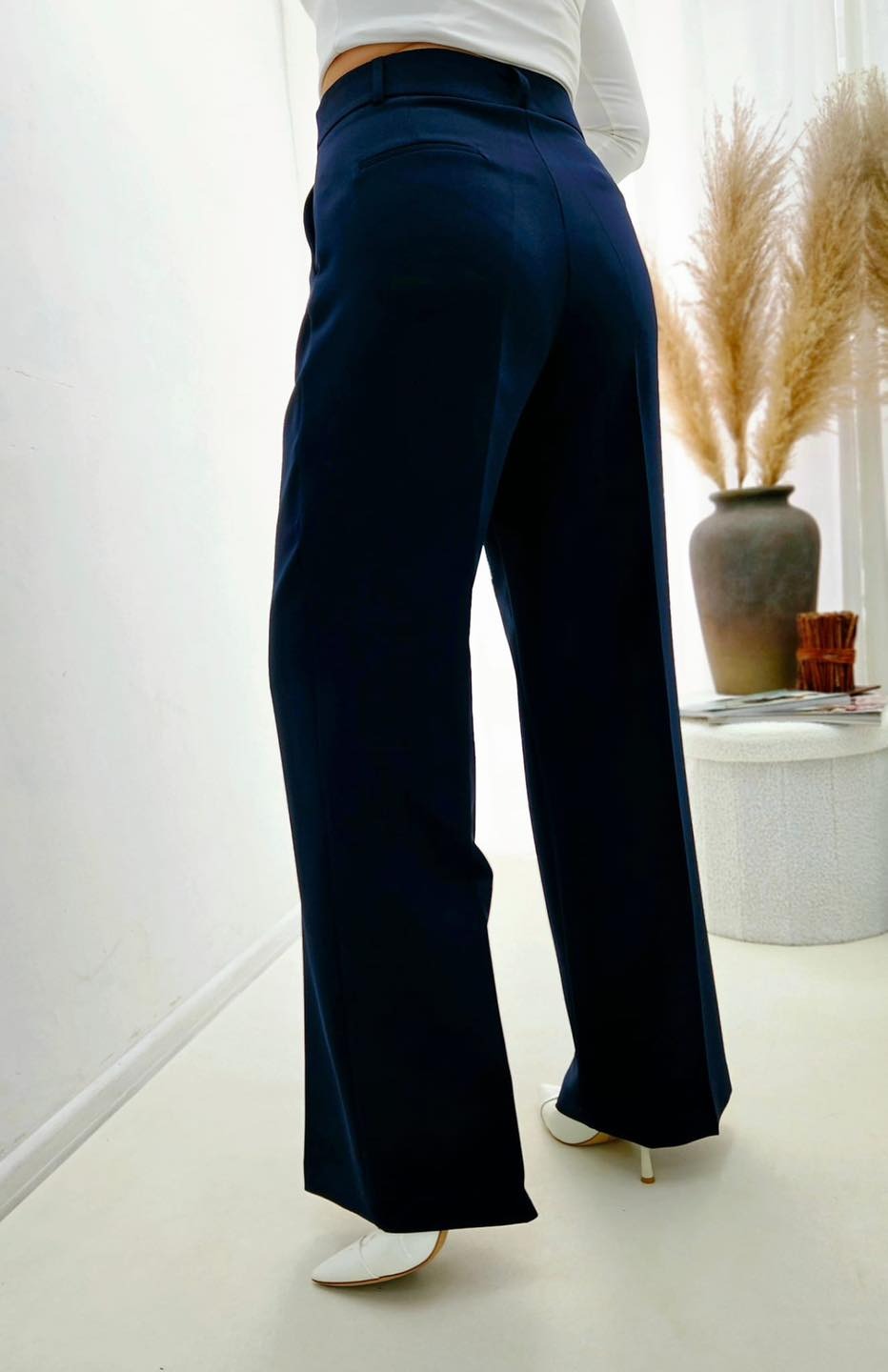 Stilingos, ilgos ir plačios mėlynos kelnės moterims aukštintu liemeniu, užsegamos užtrauktuku ir saga. Yra kišenės.