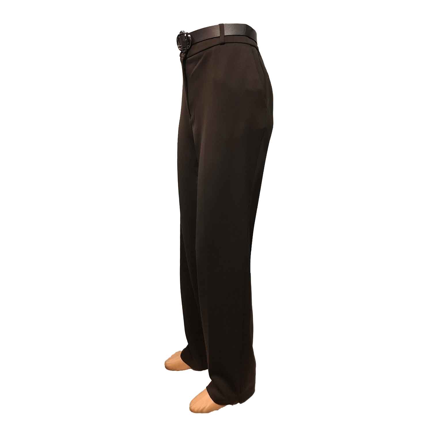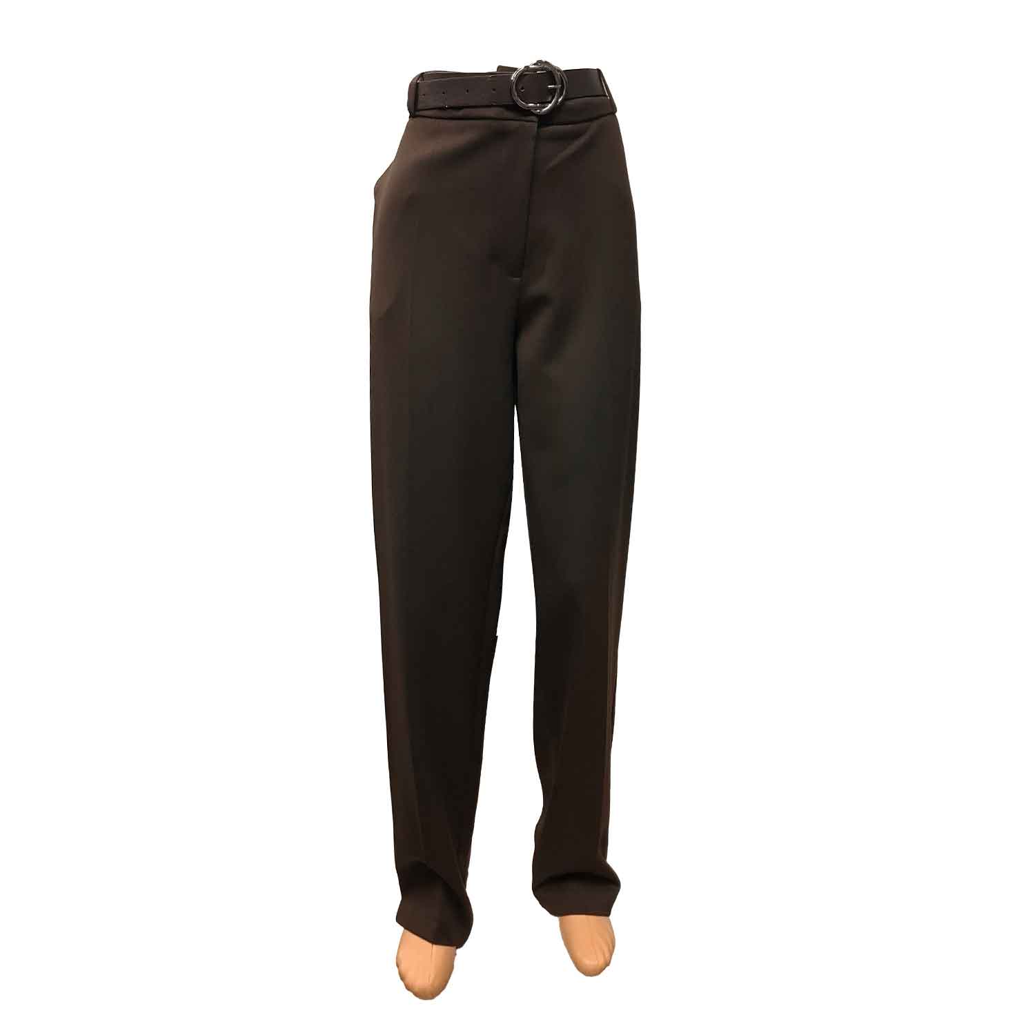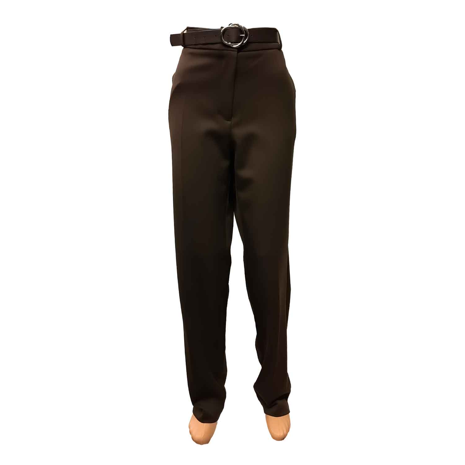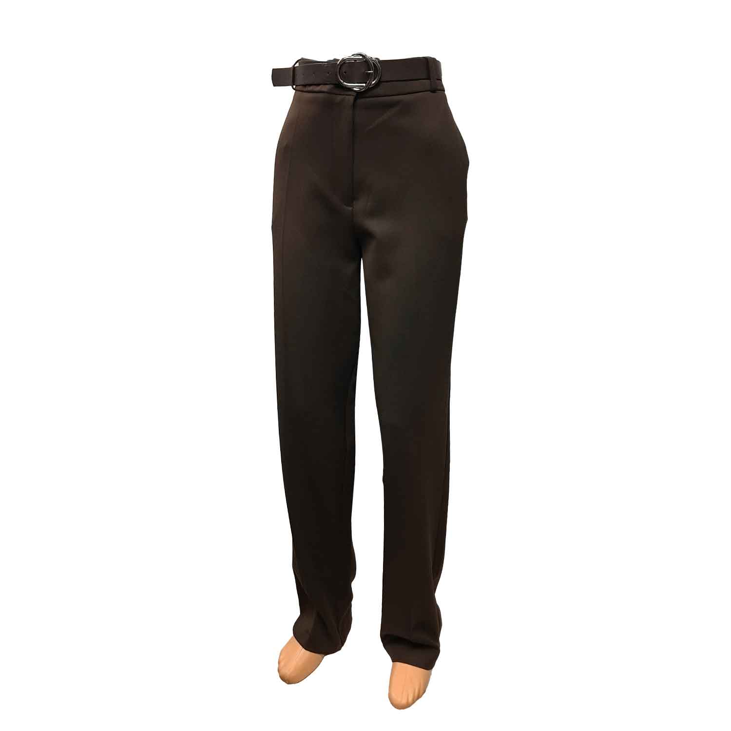 Patogios rudos tiesios kelnės moterims su guma per liemenį, užsegamos užtrauktuku ir saga. Yra kišenės.