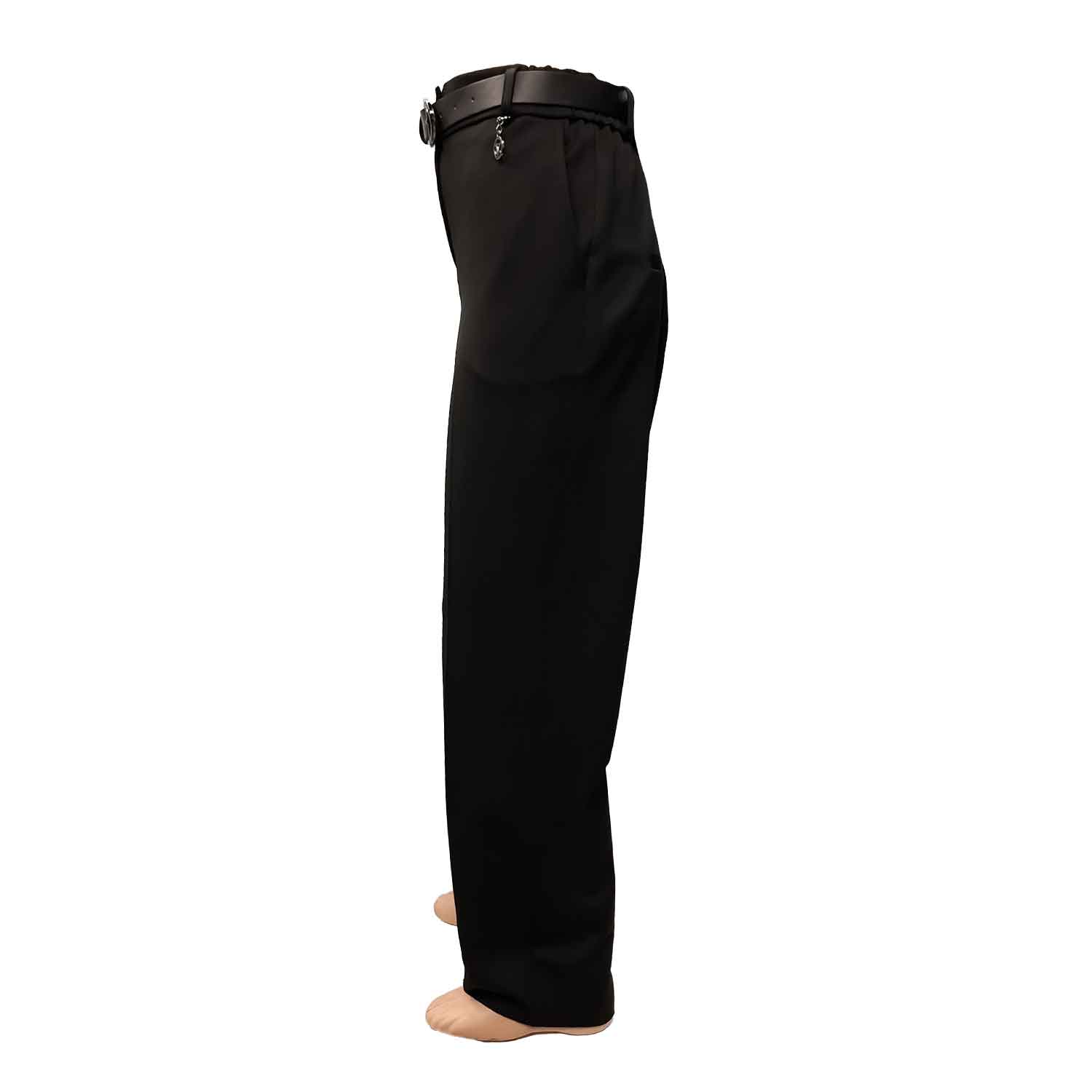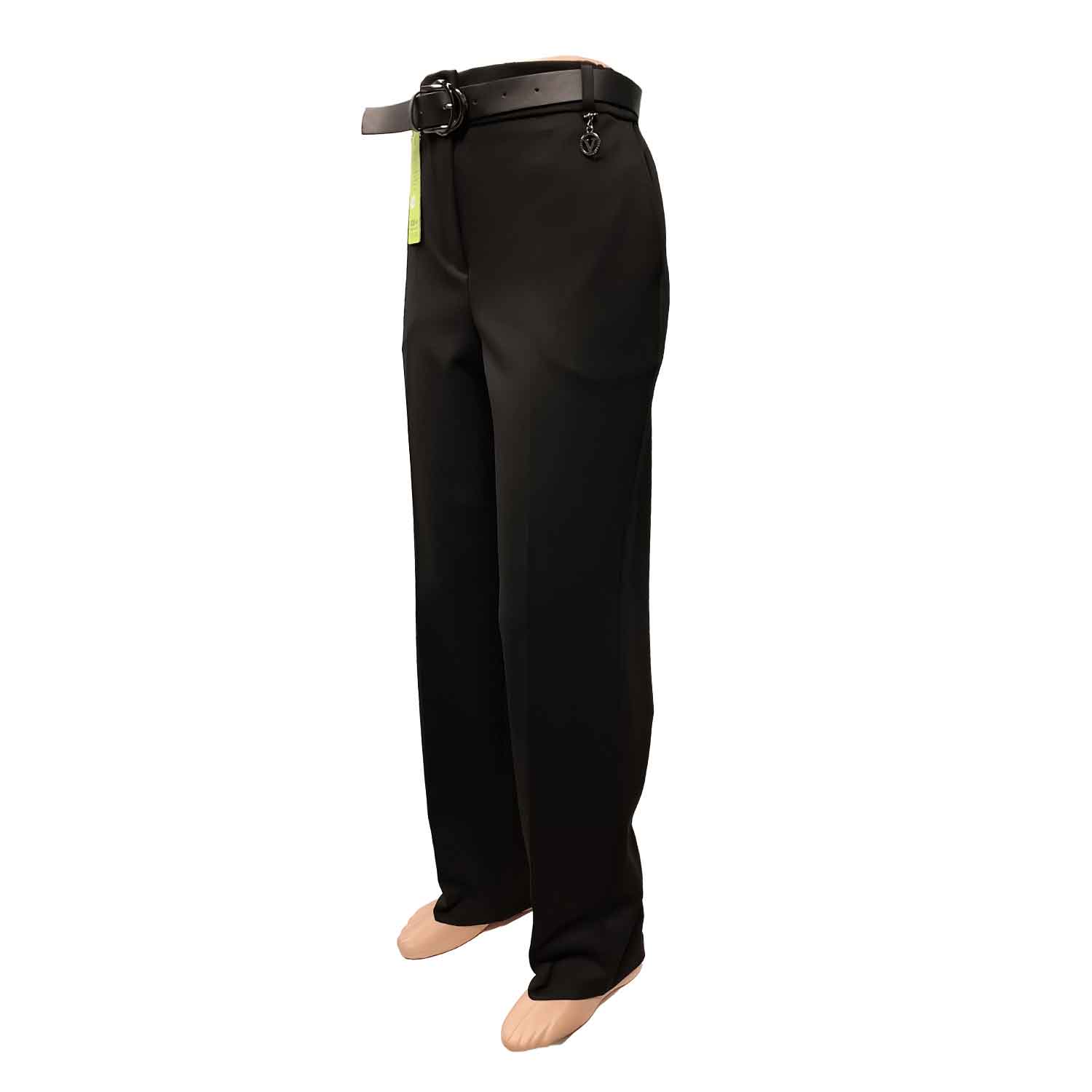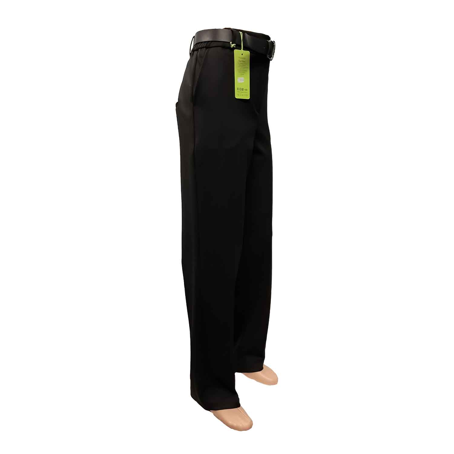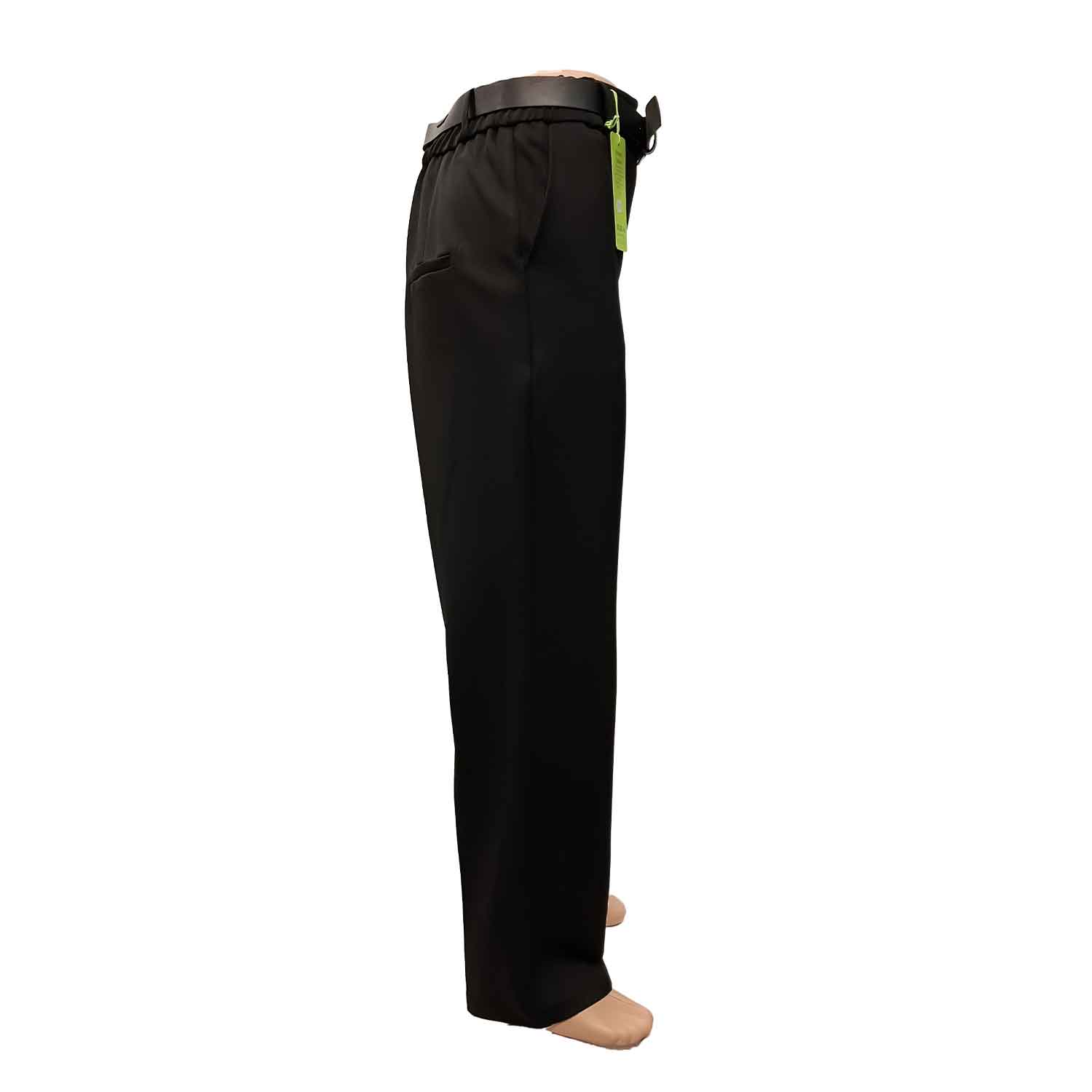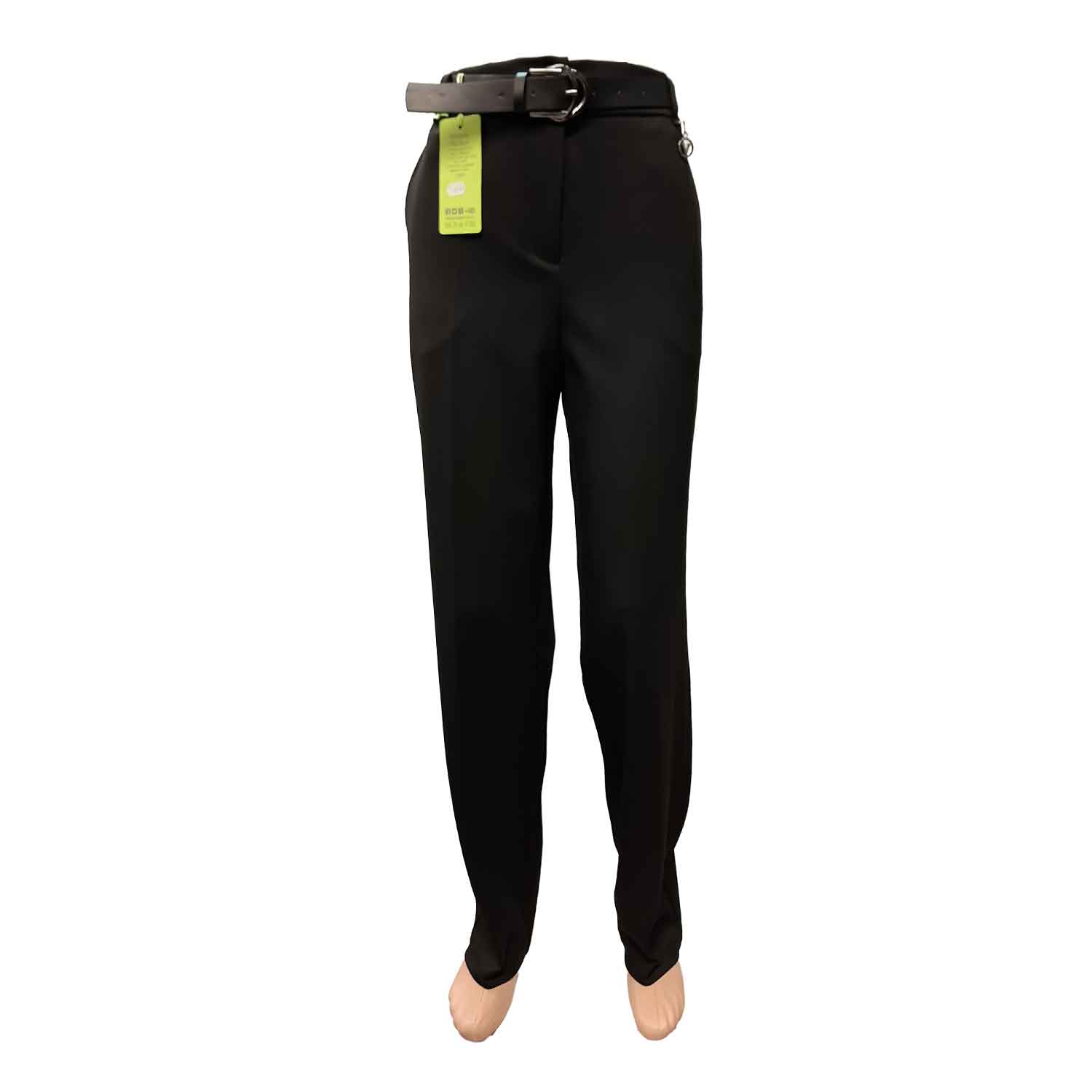 Stilingos, ilgos juodos kelnės moterims su guma per liemenį, užsegamos užtrauktuku ir saga. Yra kišenės.