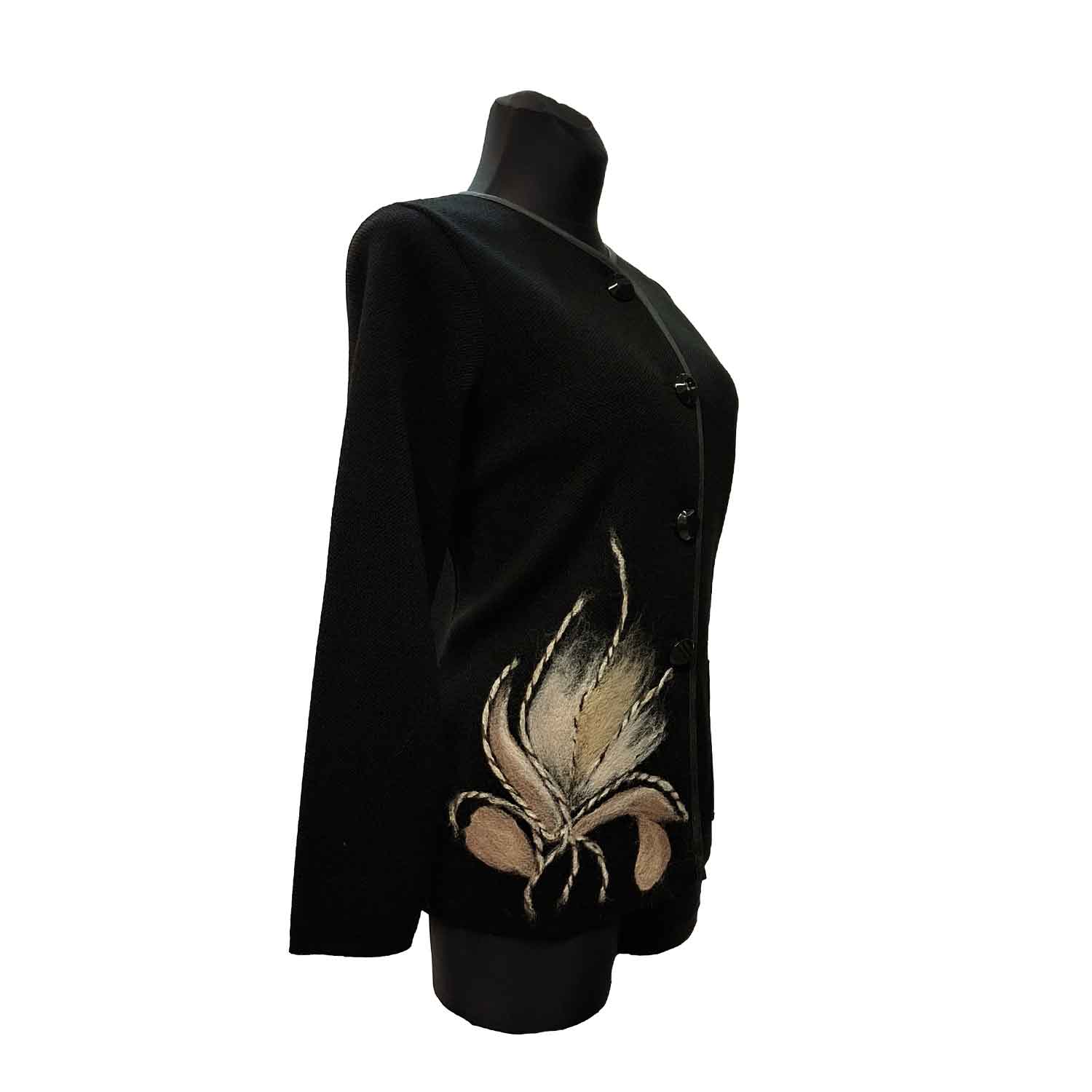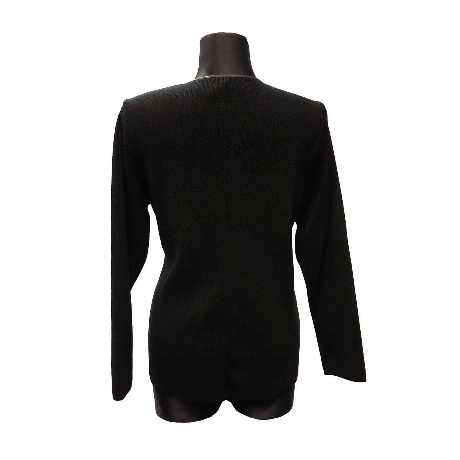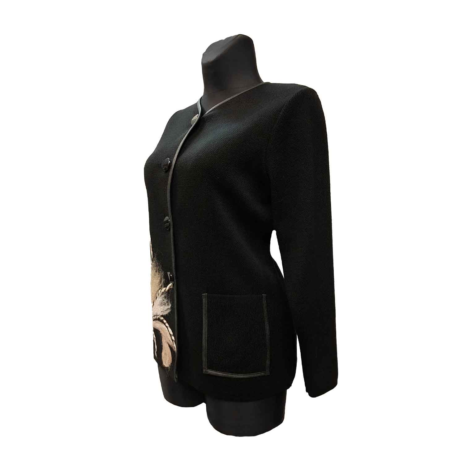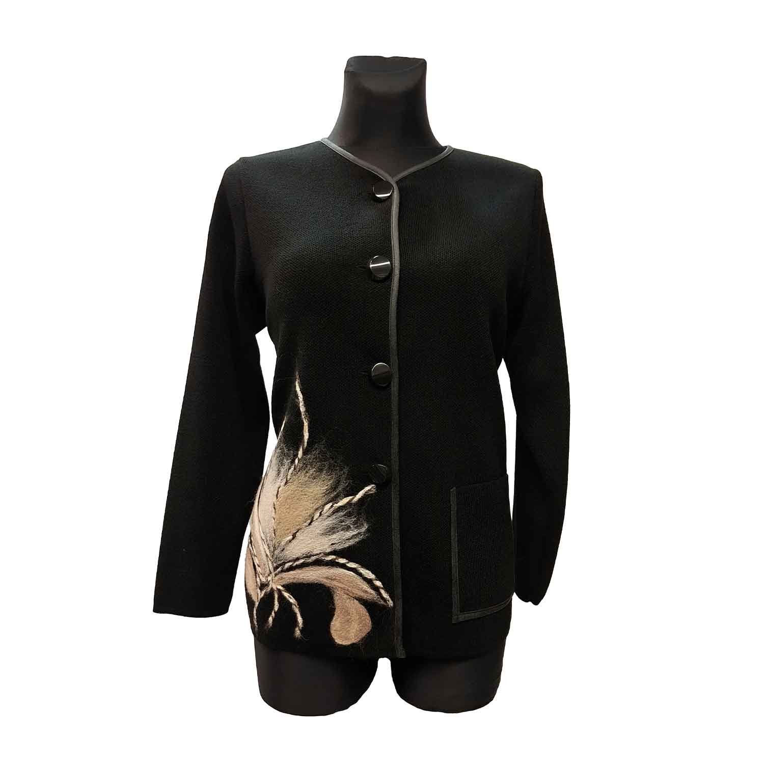 Užsegamas moteriškas megztinis kiekvienai dienai ilgomis rankovėmis. Iš priekio suformuota viena kišenė.