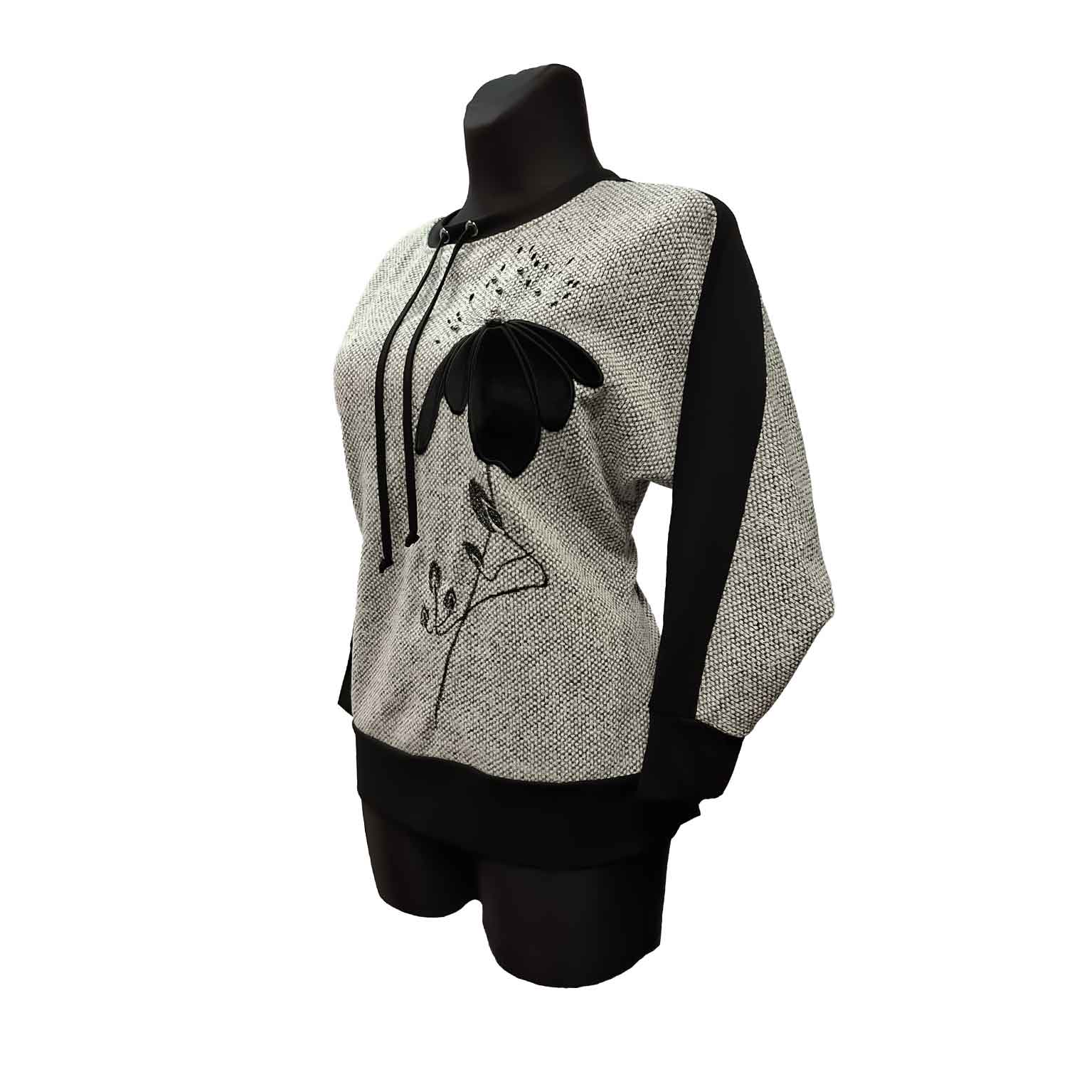 Stilinga palaidinė kasdienai. Patogus sportiškai elegantiškas siluetas su raišteliais prie kaklo, kontrastinėmis rankovėmis ir subtiliu gėlės raštu suteikia išskirtinumo.