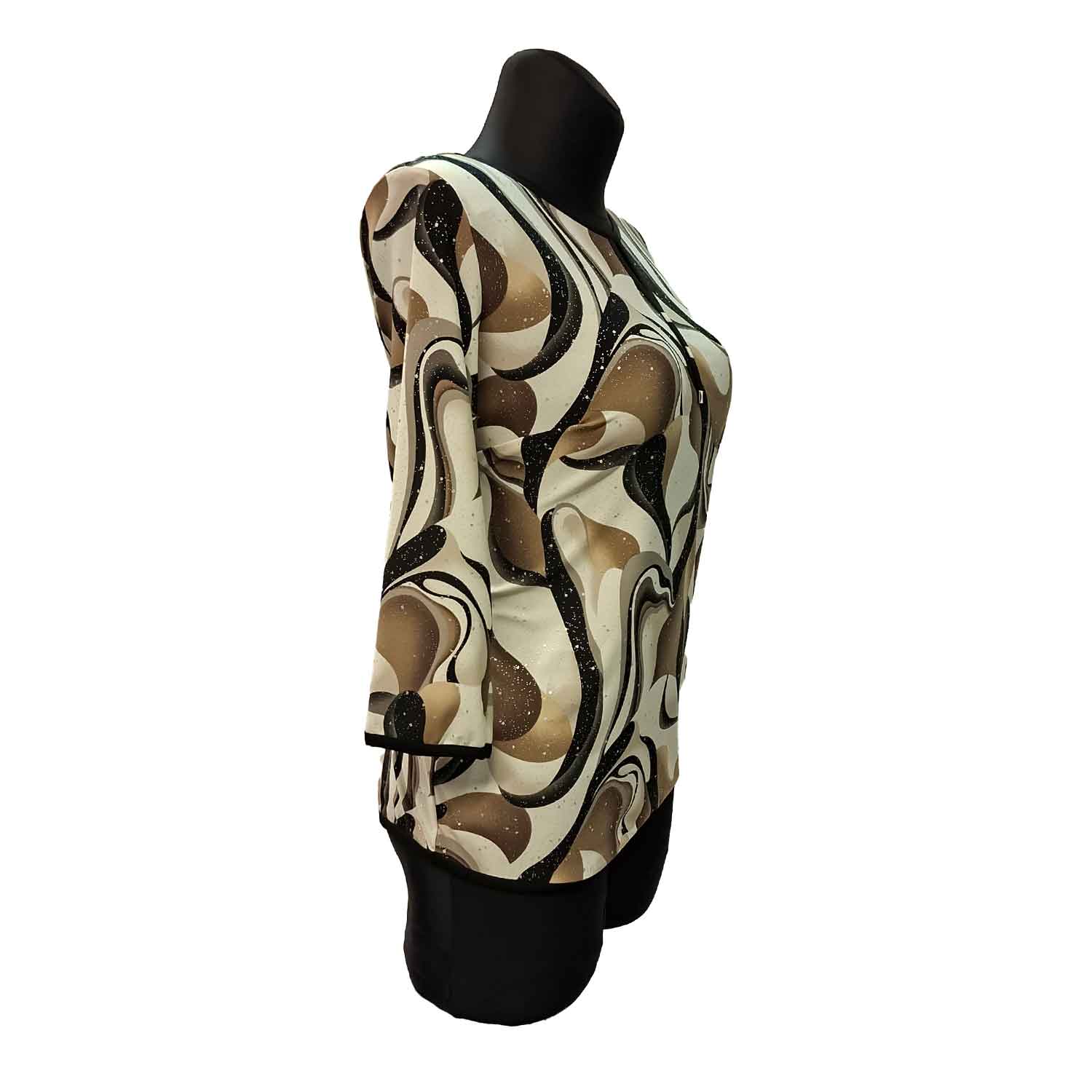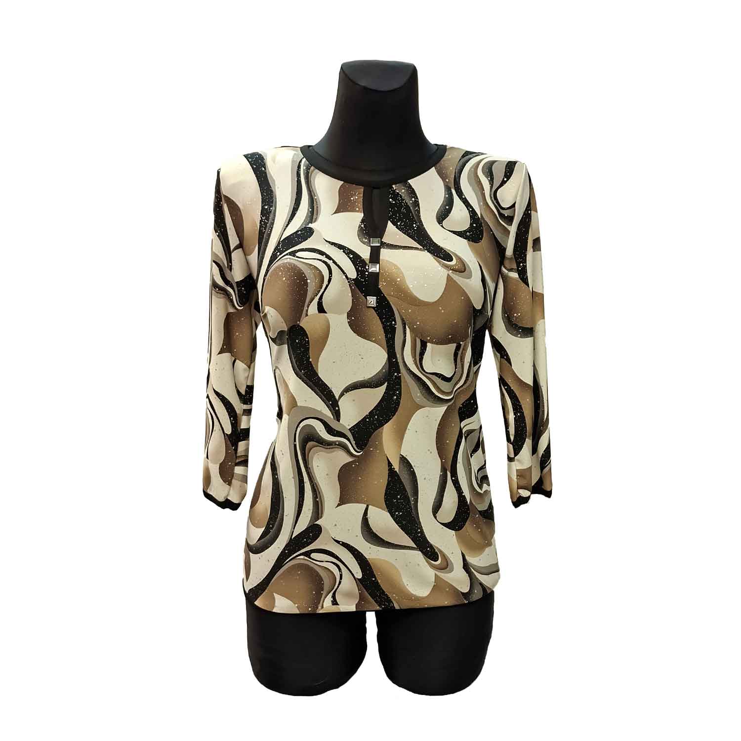 Marginta smėlio–rudos spalvos palaidinė su lengvu blizgesiu ir 3/4 rankovėmis. Išskirtinio abstraktaus rašto palaidinė žemės tonų paletėje suteikia įvaizdžiui gyvumo ir elegancijos. Lengvas, subtiliai blizgantis audinys puikiai tinka tiek kasdienai, tiek proginiam deriniui.