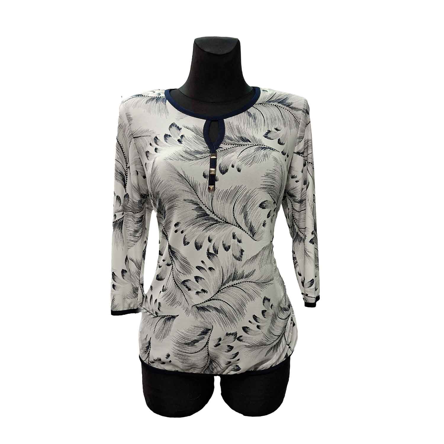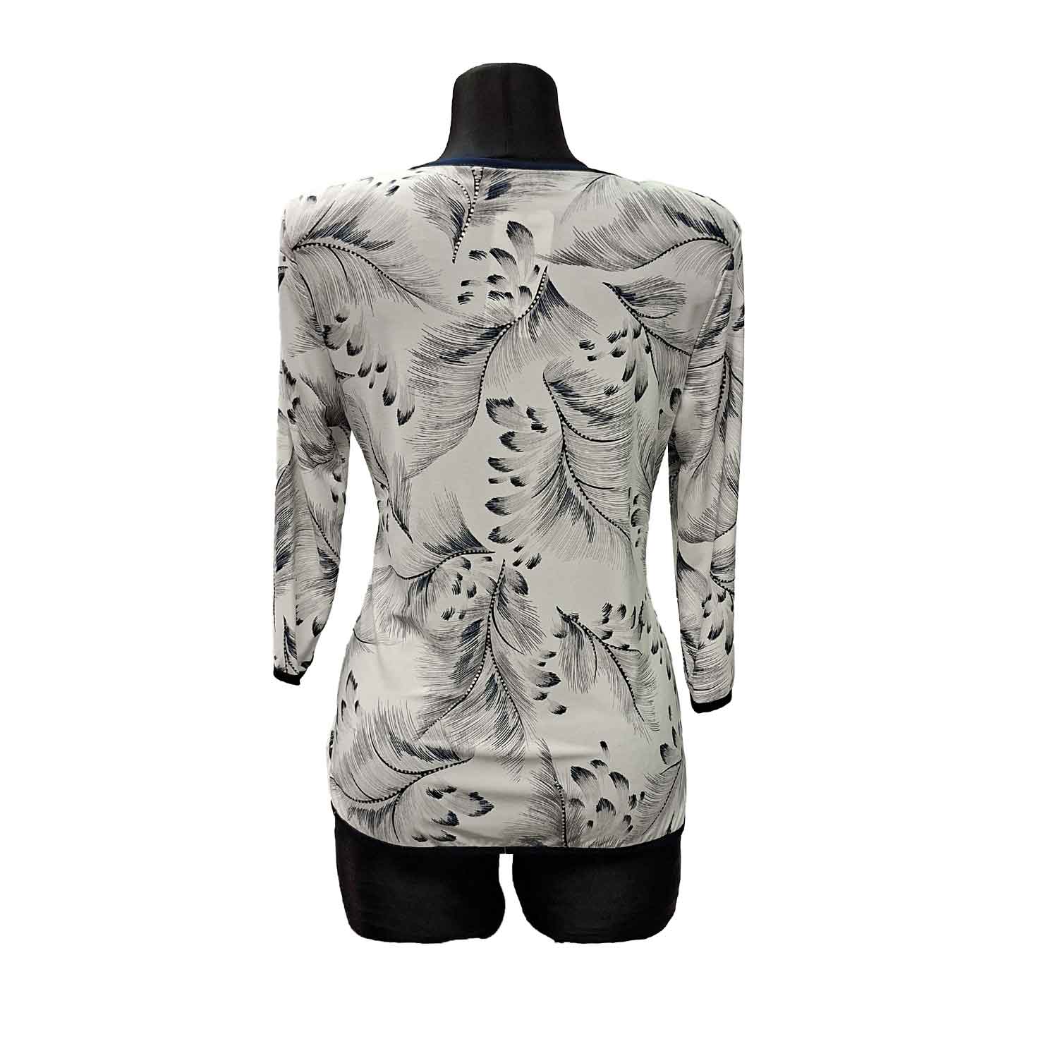 Elegantiška šviesaus atspalvio palaidinė su subtiliu, plunksnas primenančiu raštu suteikia lengvumo ir išskirtinumo įvaizdžiui. Puikiai tinka tiek kasdienai, tiek biurui, lengvai derinama su įvairiais garderobo elementais.