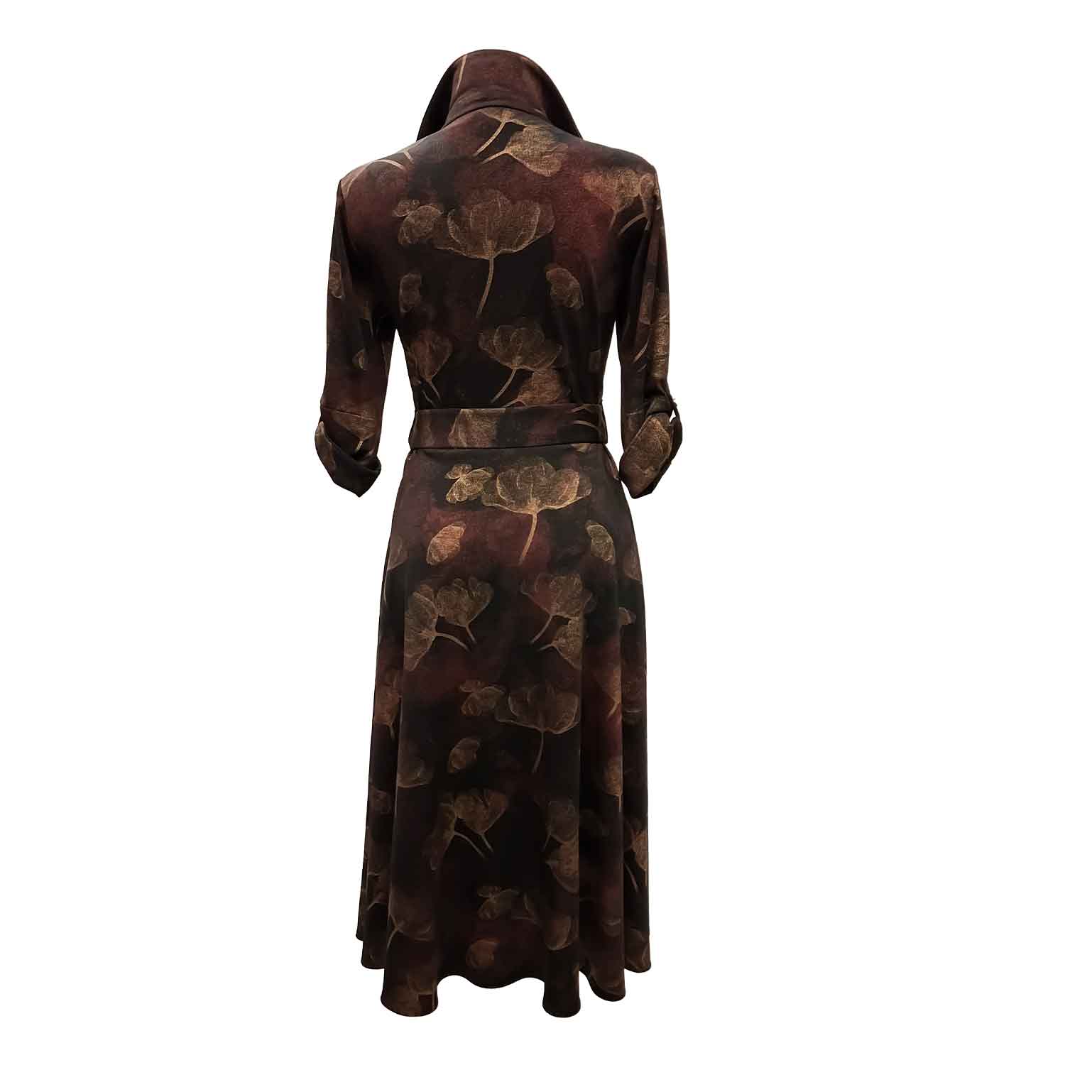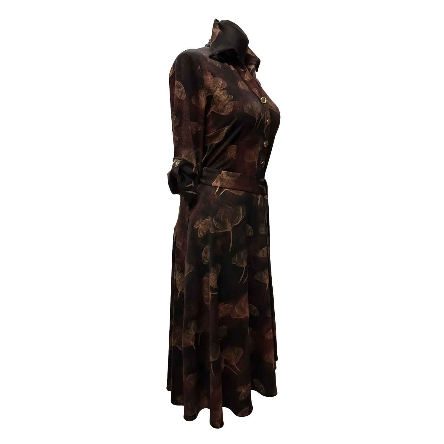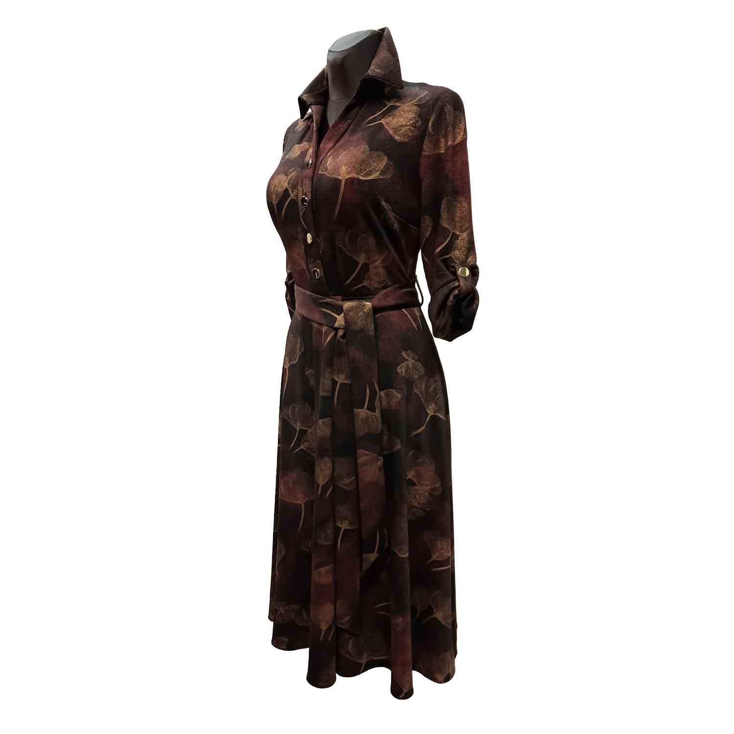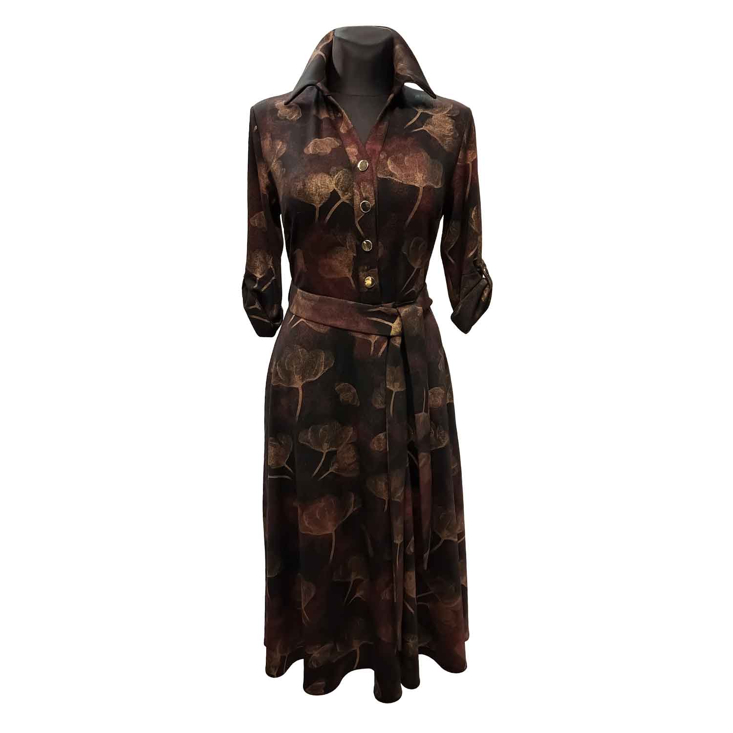 Ilgesnė suknelė su apykakle ir sagomis. Apačioje platesnė. Kirpta per liemenį. Komplekte diržiukas. Yra kišenės.
