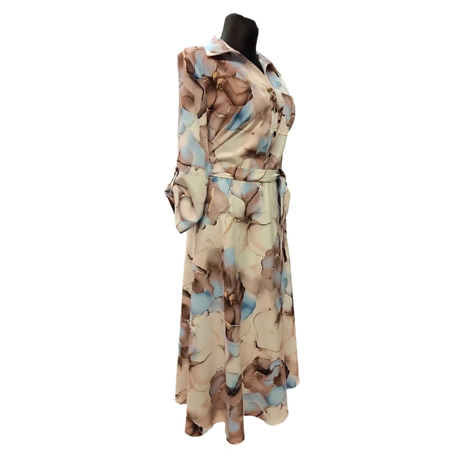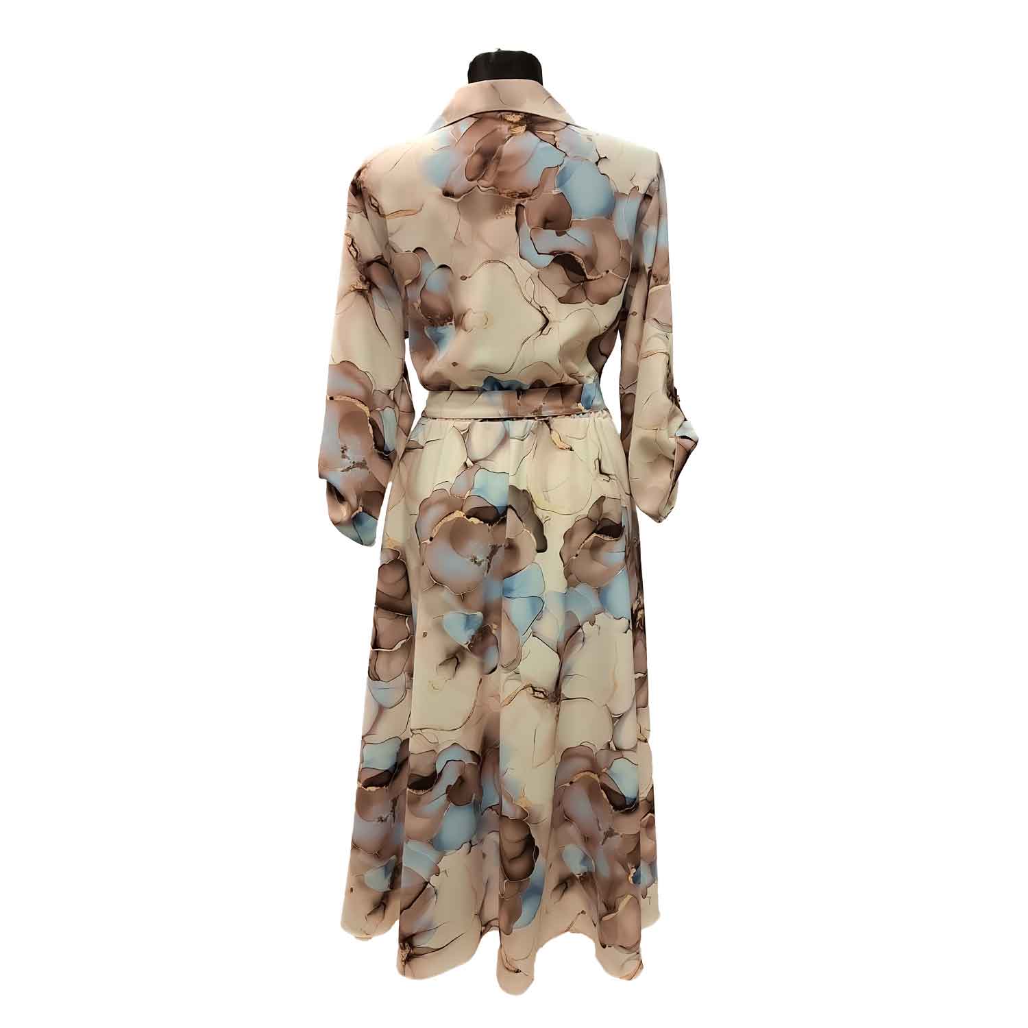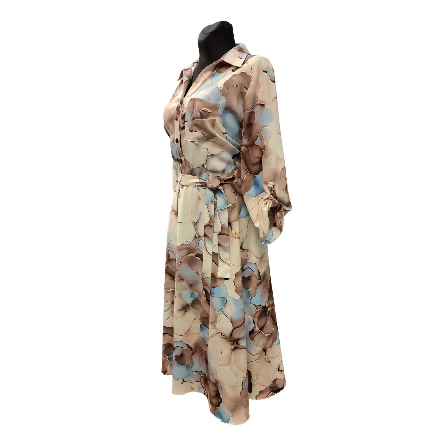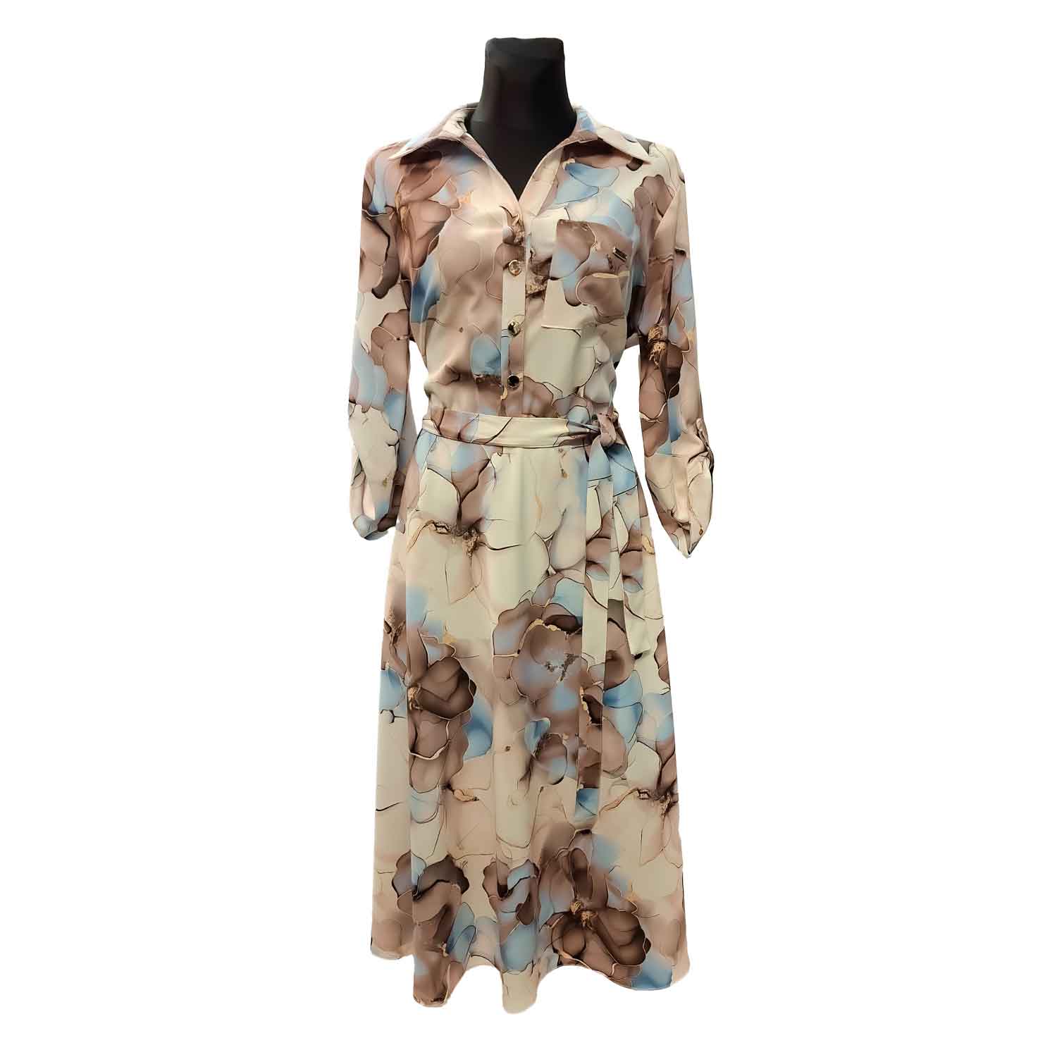 Ilgesnė suknelė su apykakle ir sagomis. Apačioje platesnė. Kirpta per liemenį. Komplekte diržiukas.