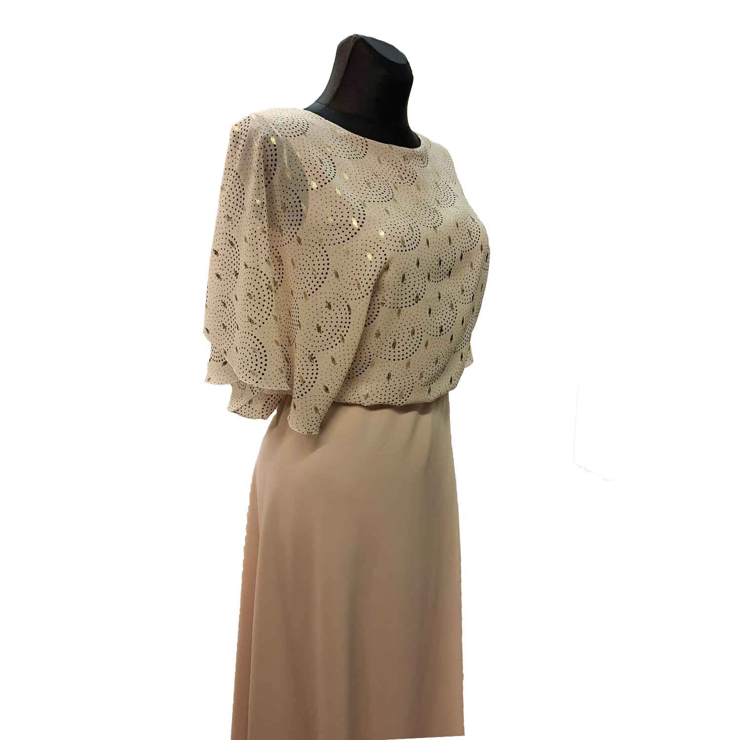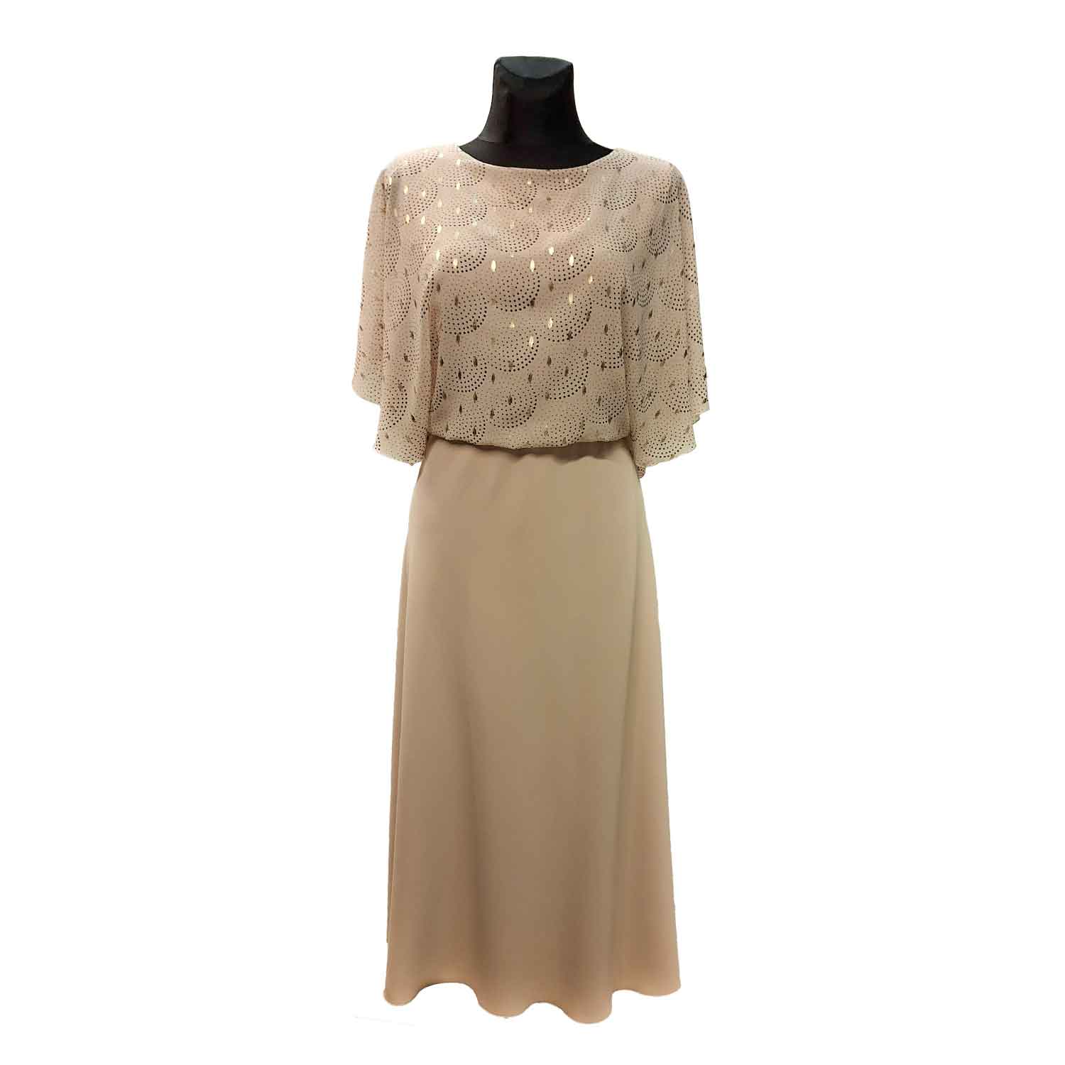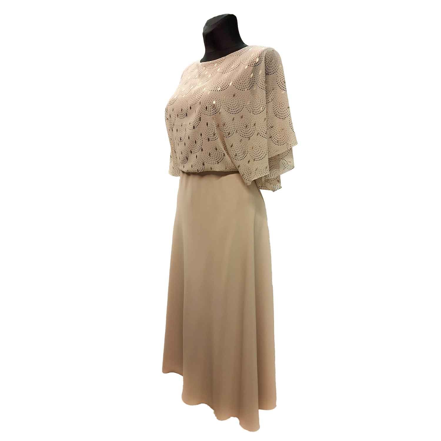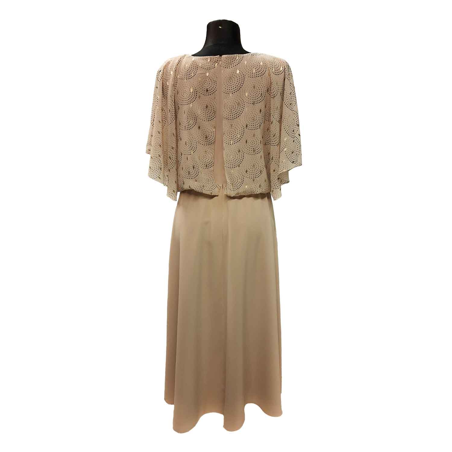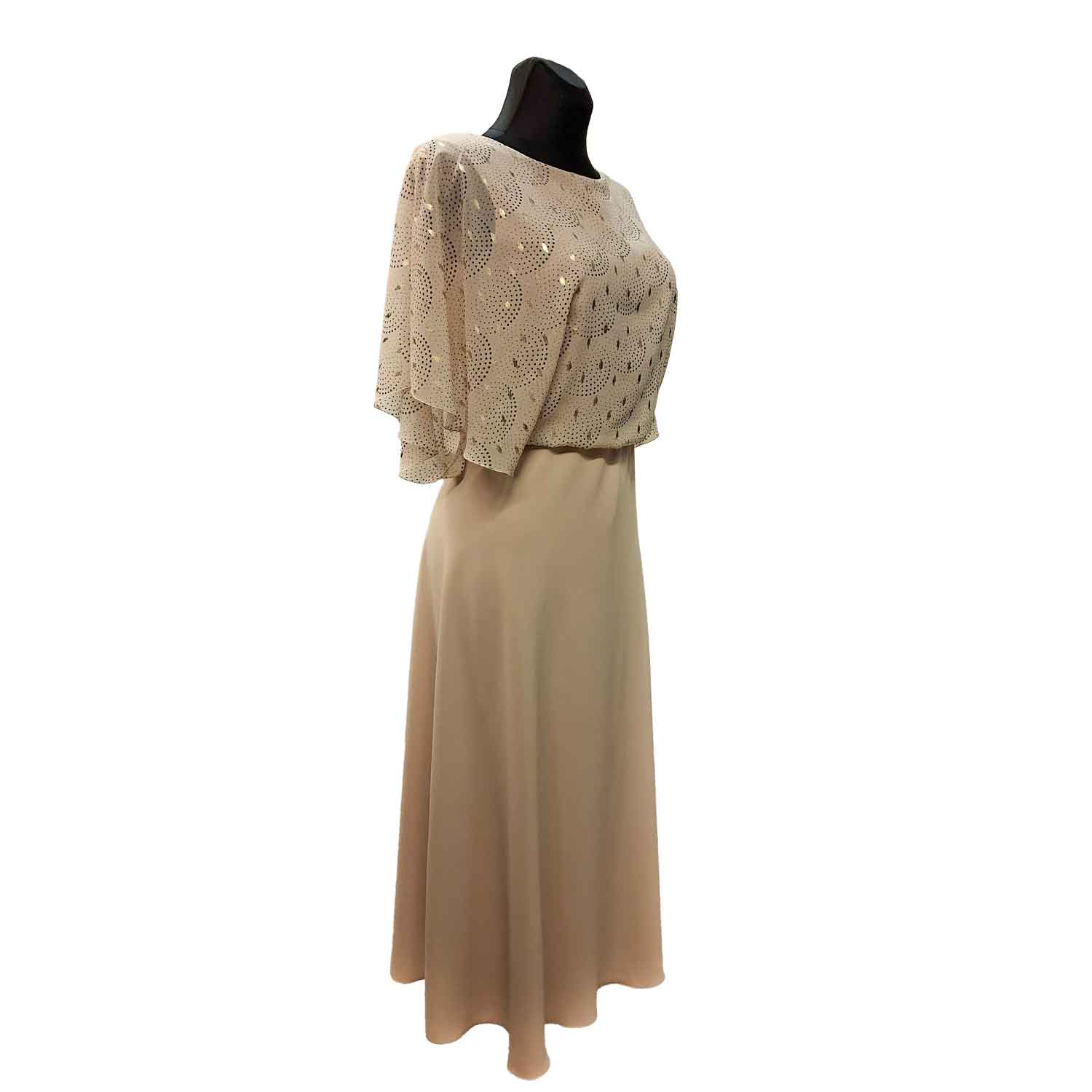 Elegantiška smėlio atspalvio suknelė, išsiskirianti subtiliu blizgesiu ir lengvai krentančia apačia. Trumpesnės, plačios rankovės suteikia papildomo lengvumo ir rafinuotumo.