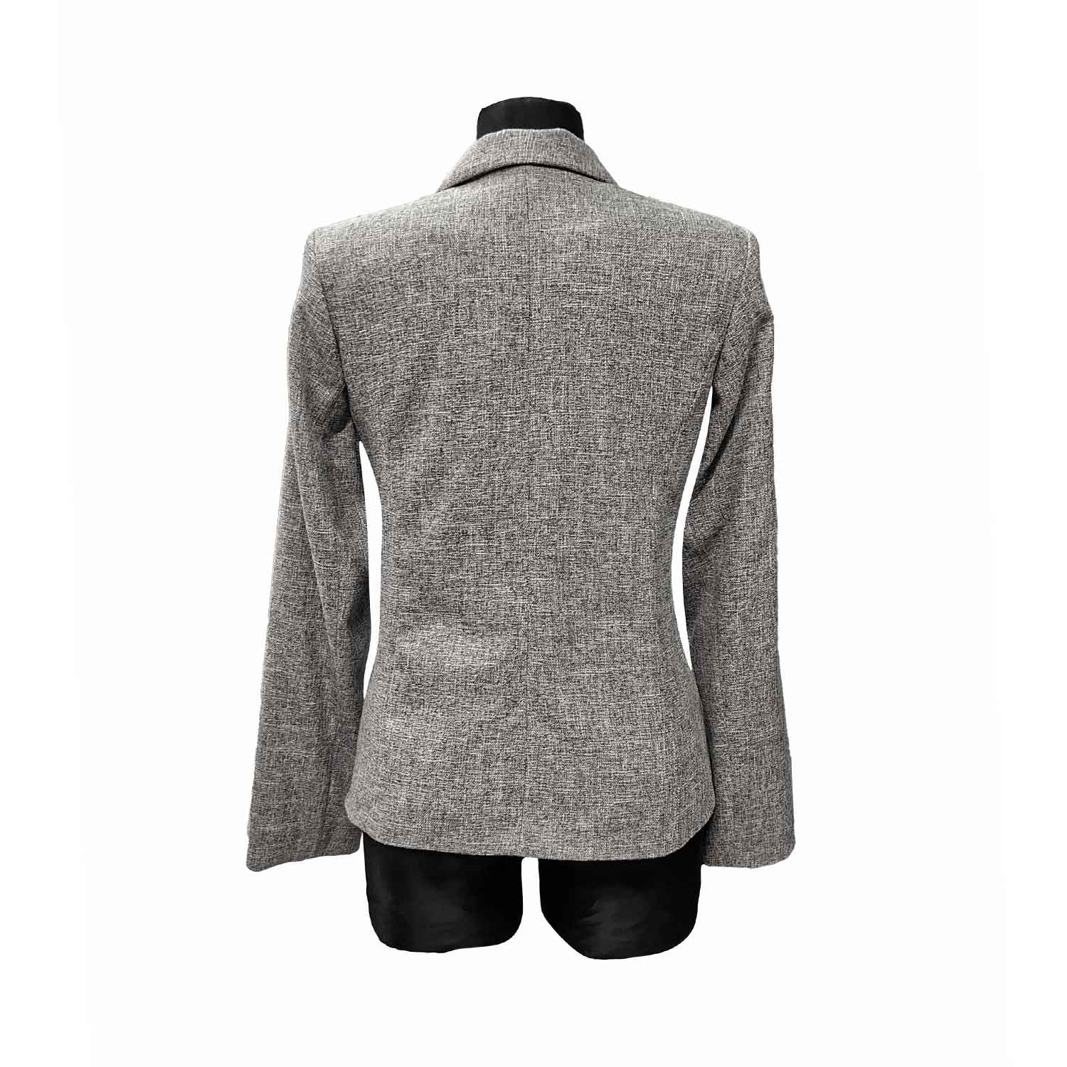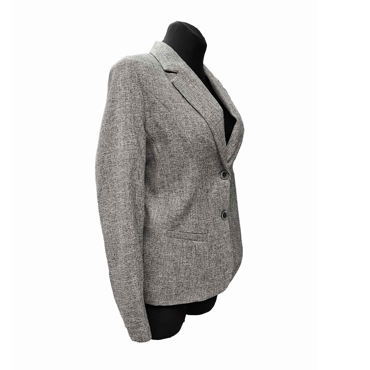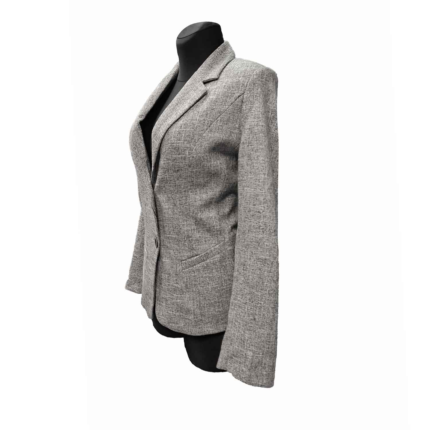 Pilkas klasikinis švarkas su pamušalu, ilgomis rankovėmis ir apykakle, iki klubų.