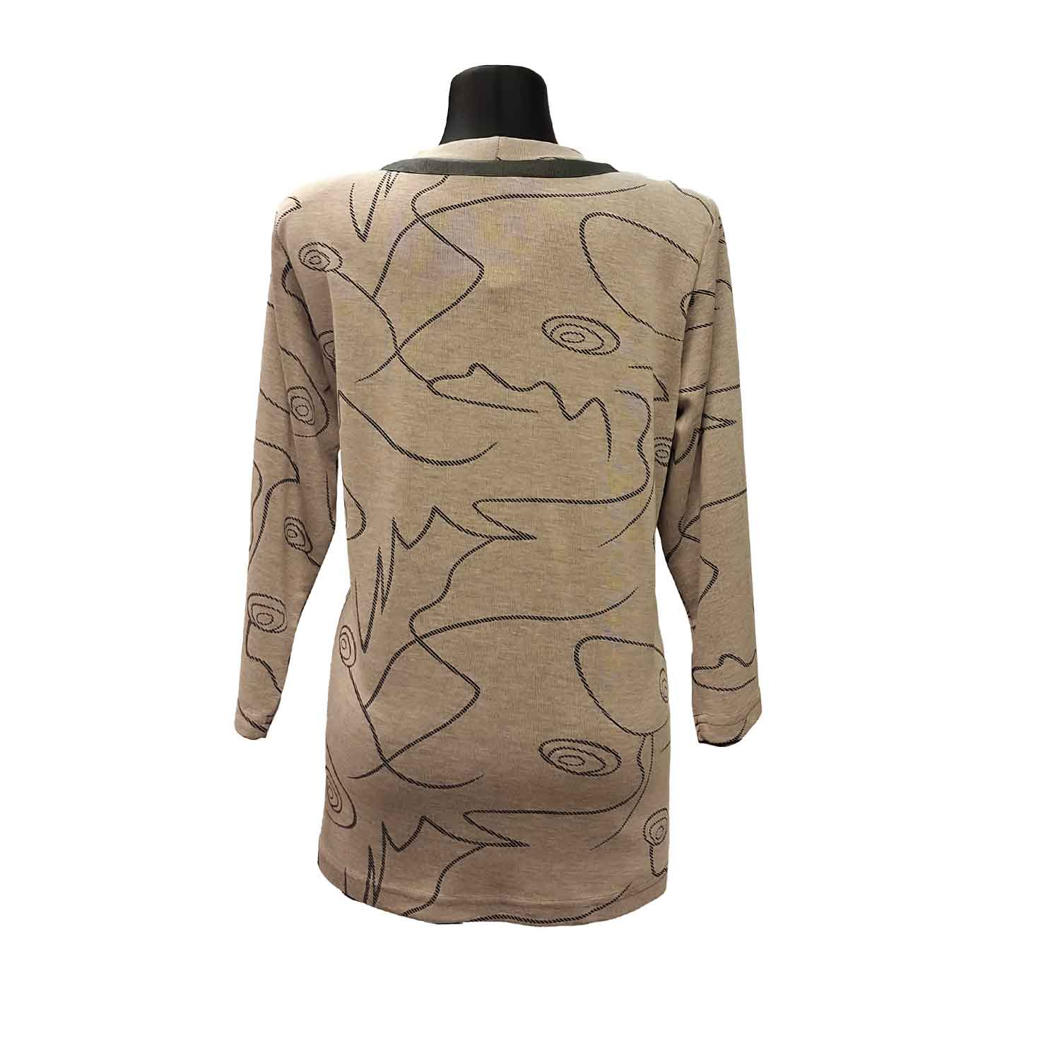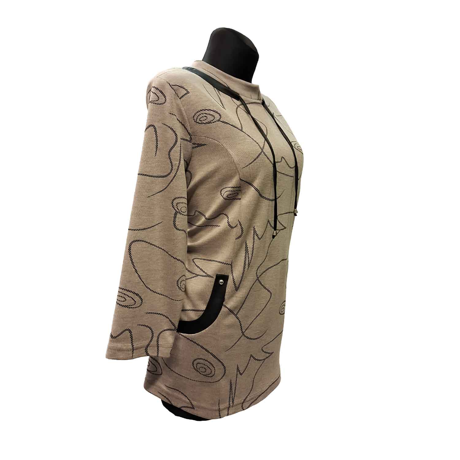 Stilinga smėlio spalvos tunika su moderniu grafiniu raštu – praktiškas ir universalus pasirinkimas kasdieniam dėvėjimui. Aukštesnė apykaklė su dekoratyviniais raišteliais suteikia šiuolaikiško charakterio. Tiesus, patogus modelis nevaržo judesių ir puikiai tinka tiek su tamprėmis, tiek su siauromis kelnėmis.